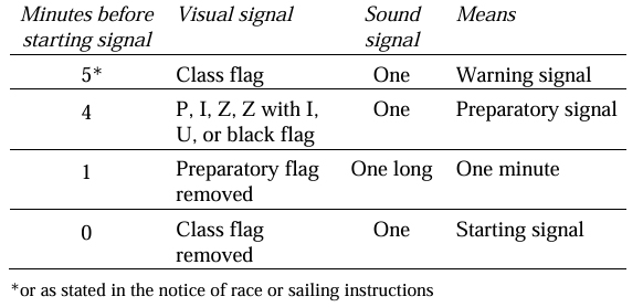 | Races shall be started by using the following signals. Times shall be taken from the visual signals; the absence of a sound signal shall be disregarded.