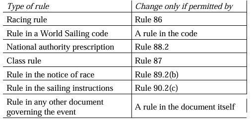 86.1 | A racing rule shall not be changed unless permitted in the rule itself or as follows: