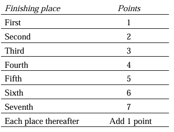 (b) points equal to the average, to the nearest tenth of a point (0.05 to be rounded upward), of her points in all the races before the race in question; or