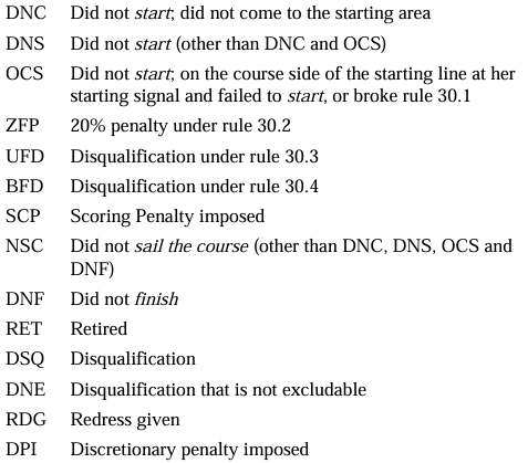 A5.2 | A boat that did not sail the course, retired or was disqualified shall be scored points for the finishing place one more than the number of boats entered in the series. A boat that is penalized under rule 30.2 or that takes a penalty under rule 44.3(a) shall be scored points as provided in rule 44.3(c). |