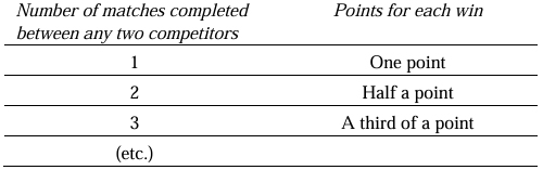 C10.1 | The winning competitor of each match scores one point (half a point each for a dead heat); the loser scores no points. |